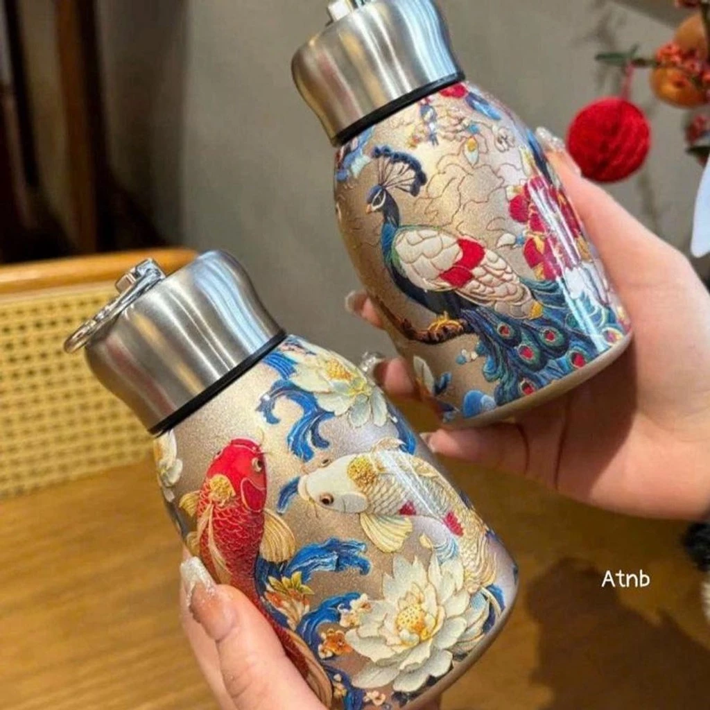 Khám phá Bình giữ nhiệt inox 316 mini 300ML Công – Cá chép CÓ QUAI XÁCH HỌA TIẾT HOA VINTAGE