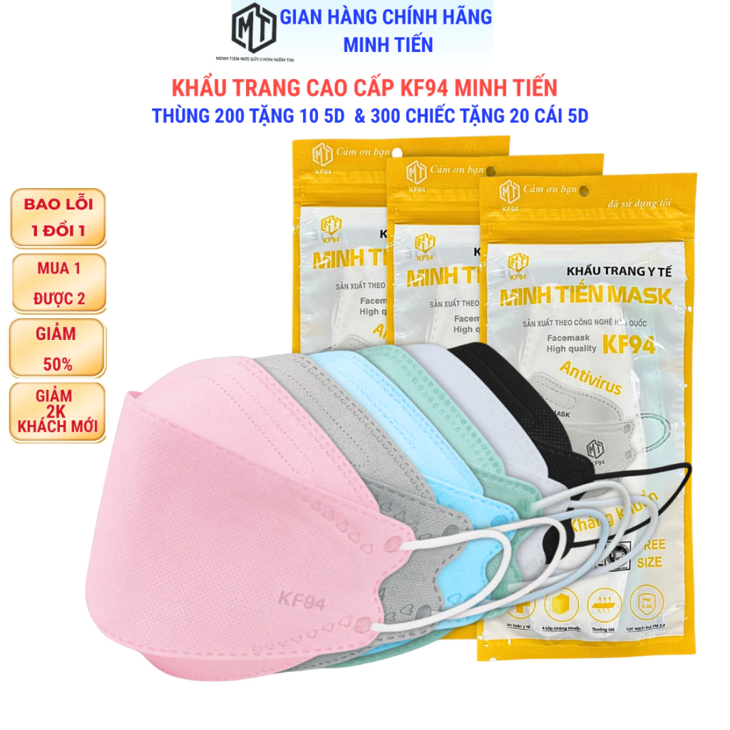 Đặc biệt, khi mua khẩu trang KF94 MINH TIẾN, bạn sẽ được tặng 30 chiếc khẩu trang 5D, giúp bạn có thể sử dụng trong thời gian dài. Với giá chỉ 90.000 đồng, khẩu trang KF94 MINH TIẾN là một lựa chọn tiết kiệm và hiệu quả cho sức khỏe của bạn.