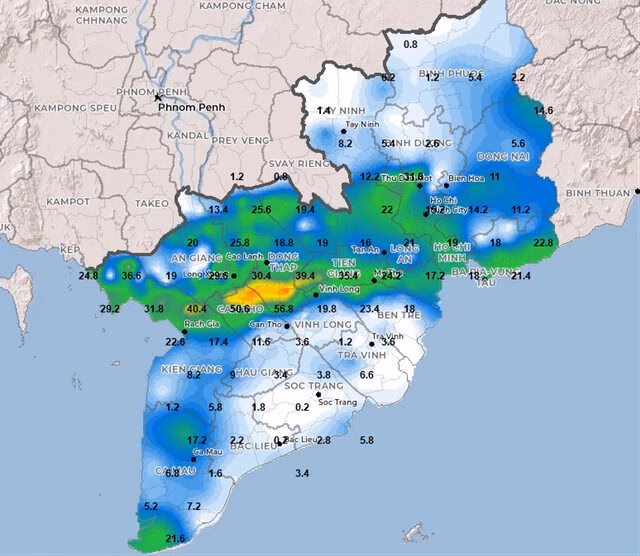 Ông Lê Đình Quyết, Đài Khí tượng thủy văn Nam bộ, cho biết trưa ngày 20.7, TP.HCM đã xuất hiện mưa giông diện rộng, kèm theo lốc và gió giật mạnh. Lượng mưa tính đến 14 giờ tại một số nơi như Củ Chi đạt 31,6mm, Long Điền 21,4mm, Phước Hội (Vũng Tàu) 19,4mm, Bà Rịa 18mm, Nhà Bè 17mm, Sở Sao 21mm, Thủ Dầu Một 21,4mm, Bình Chánh 21mm, Tam Thôn Hiệp 19mm…