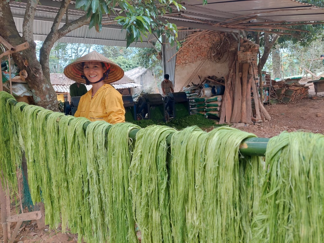 Với hơn 47.000 ha trồng dứa, Việt Nam đứng thứ 3 trong số những nước trồng nhiều dứa nhất Đông Nam Á. Tuy nhiên, sau khi thu hoạch quả, lá dứa trở thành một loại ‘rác’ nông nghiệp khó xử lý do dai, cứng và nhiều gai. Mỗi năm, khoảng 2,5 triệu tấn lá dứa bị đốt, thải ra lượng khí CO2 ước tính khoảng 1,355 kg cho mỗi tấn lá dứa bị đốt. Để giải quyết vấn đề này, các doanh nghiệp đã tìm ra cách biến lá dứa thành chất liệu may mặc tự nhiên.